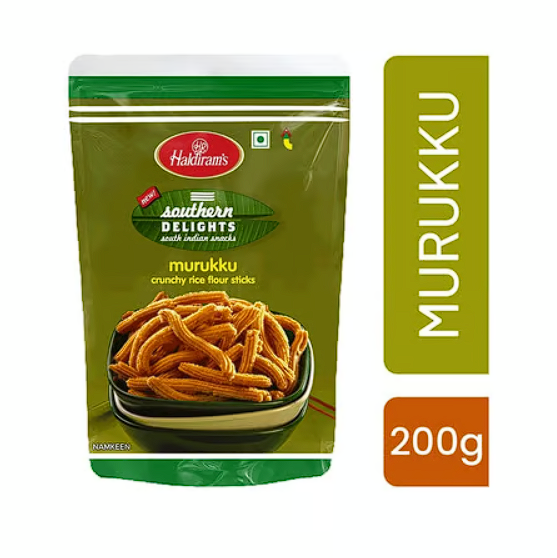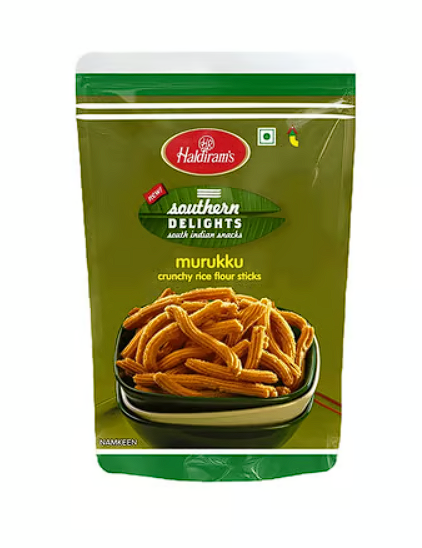 Haldiram's Murukku is a traditional South Indian snack made with rice flour and seasoned with spices. The bite-sized twists are crispy and flavorful, perfect for enjoying with tea or coffee.